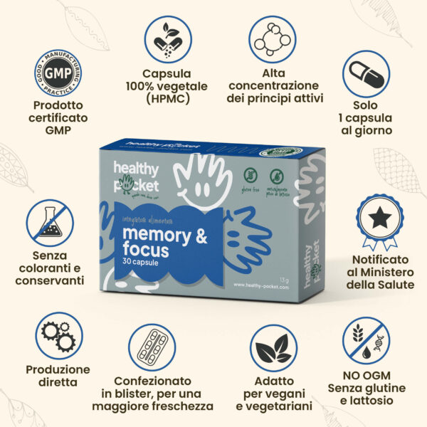 Memory & Focus è un integratore alimentare in capsule a base Bacopa utile per favorire la Memoria e funzioni cognitive, rilassamento (sonno) ed il benessere mentale. Arricchito con Rhodiola che agisce da Tonico-adattogeno contro la stanchezza fisica e mentale.
